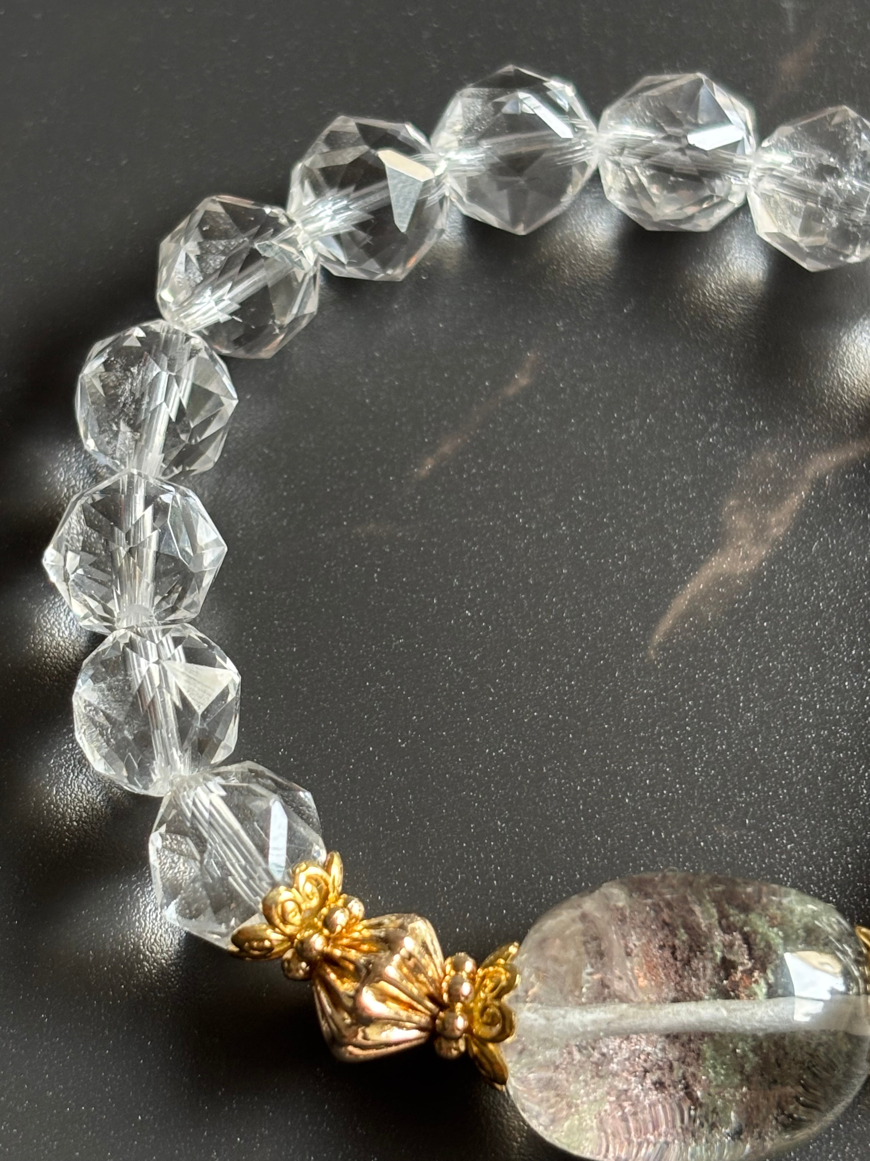 繊細なカットが施された水晶が、光を受けて美しく輝き、中央には、自然が描いた景色を閉じ込めたガーデンクォーツ。